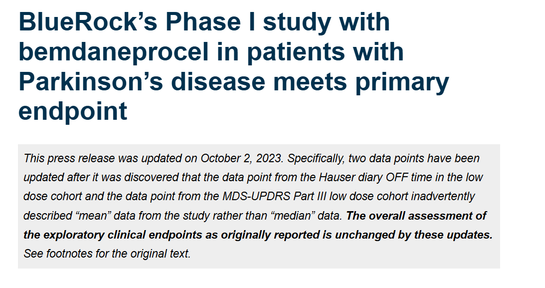 2023年10月2日,拜耳公司子公司 BlueRock Therapeutics LP 今天公布了 bemdaneprocel (BRT-DA01) I 期臨床試驗的積極數(shù)據(jù)詳情,bemdaneprocel 是一種用于治療帕金森病的干細胞衍生試驗療法。