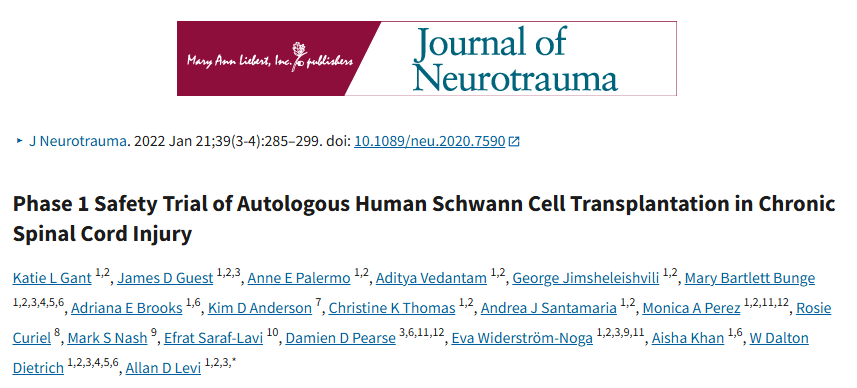 3.Gant KL, Guest JD, Palermo AE, Vedantam A, Jimsheleishvili G, Bunge MB, Brooks AE, Anderson KD, Thomas CK, Santamaria AJ, Perez MA, Curiel R, Nash MS, Saraf-Lavi E, Pearse DD, Widerstr?m-Noga E, Khan A, Dietrich WD, Levi AD. Phase 1 Safety Trial of Autologous Human Schwann Cell Transplantation in Chronic Spinal Cord Injury. J Neurotrauma. 2022 Feb;39(3-4):285-299. doi: 10.1089/neu.2020.7590. Epub 2021 May 3. PMID: 33757304; PMCID: PMC9360180.