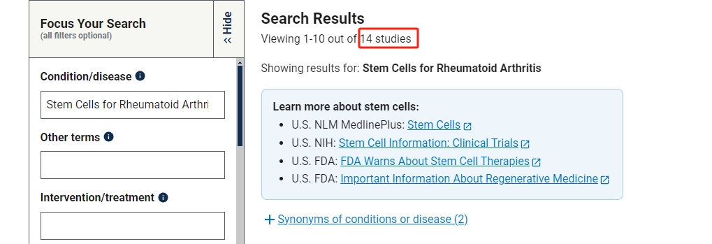截止2024年8月2日,在美國國立衛(wèi)生研究院的最大臨床試驗注冊庫clinicaltrials.gov網(wǎng)站上注冊的有關干細胞治療類風濕關節(jié)炎臨床研究項目有14項。其中國內(nèi)發(fā)布的占據(jù)4項。