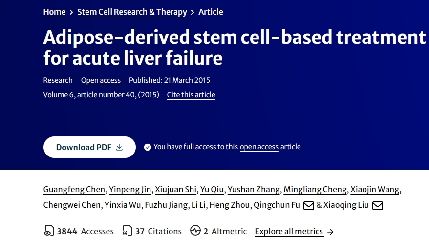 2015年3月21日,同濟(jì)大學(xué)醫(yī)學(xué)院第十人民醫(yī)院聯(lián)合南京軍區(qū)上海肝病研究中心在國(guó)際期刊《Stem Cell Research & Therapy》上發(fā)表了一篇關(guān)于Adipose-derived stem cell-based treatment for acute liver failure(基于脂肪干細(xì)胞的急性肝衰竭治療)的文章。