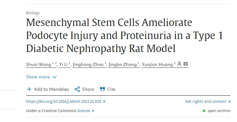 [16]Shuai Wang, Yi Li, Jinghong Zhao, Jingbo Zhang, Yunjian Huang,Mesenchymal Stem Cells Ameliorate Podocyte Injury and Proteinuria in a Type 1 Diabetic Nephropathy Rat Model,Biology of Blood and Marrow Transplantation,Volume 19, Issue 4,2013,Pages 538-546,ISSN 1083-8791,https://doi.org/10.1016/j.bbmt.2013.01.001.