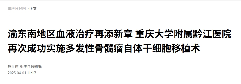 技術(shù)亮點:2025年4月,該院血液內(nèi)科團(tuán)隊聯(lián)合重慶大學(xué)附屬腫瘤醫(yī)院、重慶醫(yī)科大學(xué)附屬第一、第二醫(yī)院、陸軍軍醫(yī)大學(xué)附屬第二醫(yī)院等再次成功為渝東南片區(qū)多發(fā)性骨髓瘤患者實施自體干細(xì)胞移植術(shù),標(biāo)志著該技術(shù)已經(jīng)在區(qū)域內(nèi)能夠的成熟應(yīng)用了。[14]