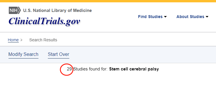 截止2022年12,在美國國立衛(wèi)生研究院的最大臨床試驗(yàn)注冊庫clinicaltrials.gov網(wǎng)站上注冊的有關(guān)干細(xì)胞治療腦癱的臨床研究項(xiàng)目有29項(xiàng)。