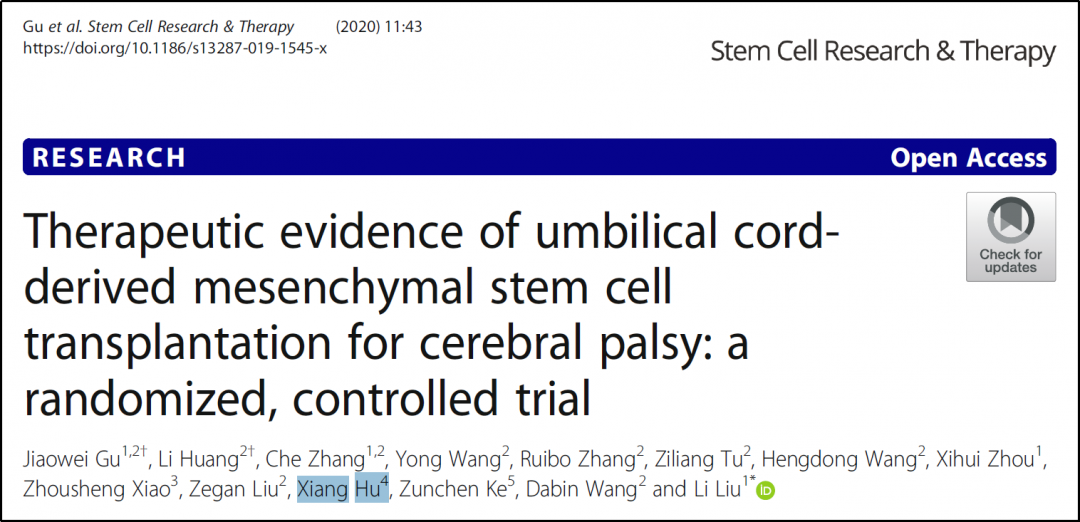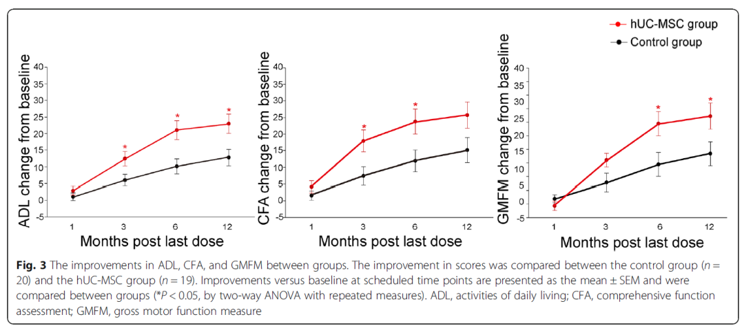 40例符合條件的患者隨機(jī)分為hUC-MSC(人臍帶間充質(zhì)干細(xì)胞)治療組和對(duì)照組。除康復(fù)治療,hUC-MSC組接受4次靜脈輸注hUC-MSCs,對(duì)照組則接受安慰劑。通過12個(gè)月的隨訪進(jìn)行安全性評(píng)估(通過不良事件(AEs) )和有效性評(píng)估(通過日常生活活動(dòng)能力(ADL)量表、綜合健康功能評(píng)估(CFA)和粗大運(yùn)動(dòng)功能評(píng)估量表(GMFM) )。
