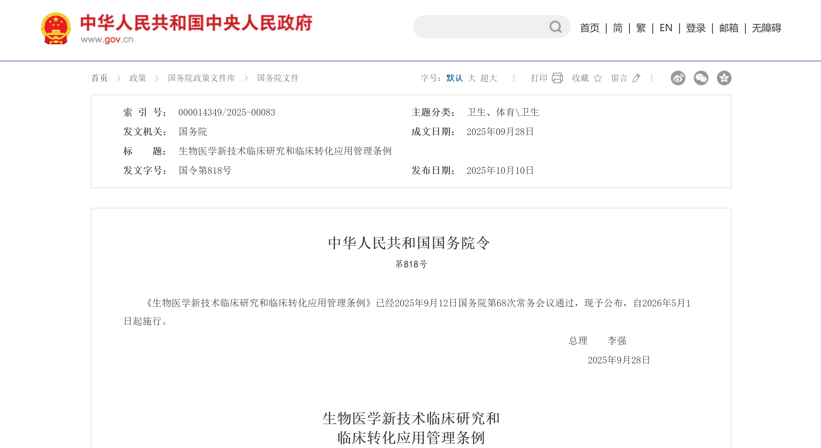 2025年9月28日,國(guó)務(wù)院總理李強(qiáng)簽署第818號(hào)令,正式公布《生物醫(yī)學(xué)新技術(shù)臨床研究和臨床轉(zhuǎn)化應(yīng)用管理?xiàng)l例》。這部將于2026年5月1日施行的法規(guī),被業(yè)界視為中國(guó)生物醫(yī)學(xué)領(lǐng)域的“基本法”,標(biāo)志著細(xì)胞與基因治療等前沿技術(shù)正式邁入“有法可依、有序創(chuàng)新”的全新發(fā)展階段