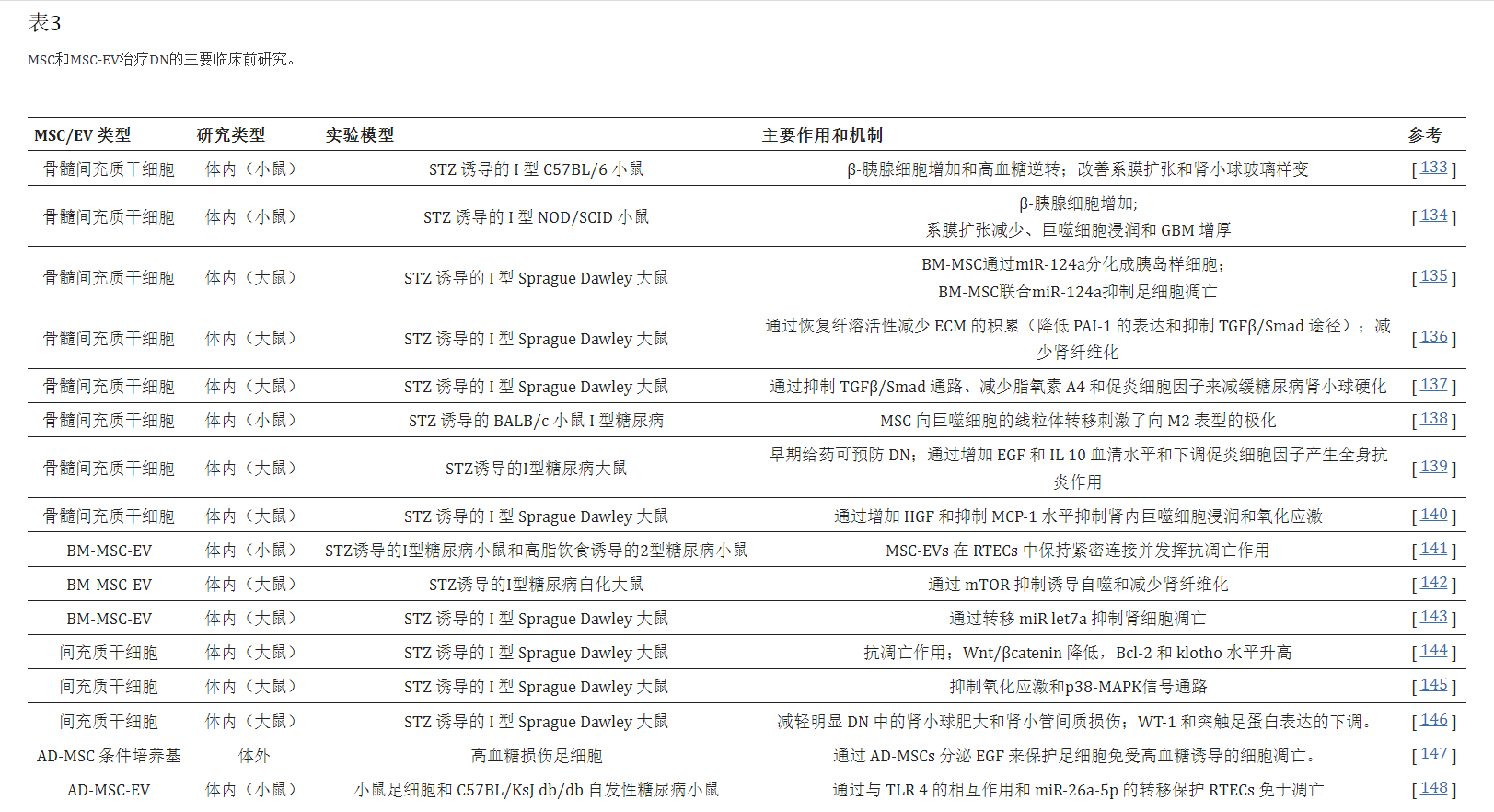 糖尿病腎病是西方國(guó)家終末期腎病的主要原因之一。在過(guò)去十年中,干細(xì)胞療法已被用作糖尿病的治療,總體上取得了可喜的結(jié)果,盡管僅在臨床前模型中 (表3)。除了BM-MSC,還有幾項(xiàng)研究使用了其他類(lèi)型的SC,如EPC、iPSC 和尿源性SC(USC),將在以下小段中單獨(dú)分析。