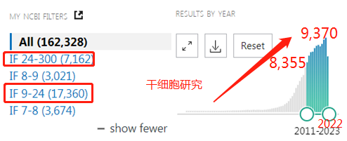 到2022年11月23日,干細胞研究領域已經發(fā)表了42萬篇PubMed收錄的論文,其中近10年就發(fā)表了23萬篇。干細胞研究成果15.1%發(fā)表在9分+期刊,4.4%發(fā)表在24分以上期刊。
