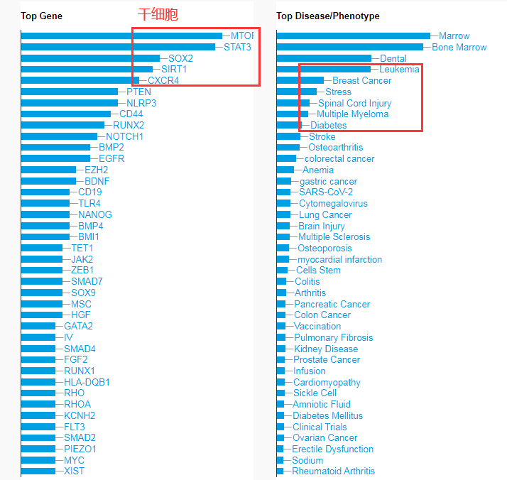 如下圖所示, 白血病、乳腺癌、脊髓損傷、多發(fā)性骨髓瘤、糖尿病等是干細胞研究中最關注的疾病。其他疾病還包括中風、骨關節(jié)炎、大腸癌、貧血、胃癌、SARS-CoV-2、肺癌、腦損傷、多發(fā)性硬化癥、骨質疏松癥等。