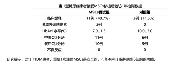通過這個數據可以看出,通過間充質干細胞治療的27例患者中,3例患者是脫離了外源胰島素,也就是說自身已經可以開始分泌胰島素了。這是過往傳統的治療方法所無法做到的。11例患者得到緩解,也就是外源胰島素用量降低。而剩下的13例,則沒有太大變化。這很有可能是干細胞被其他組織器官“拐走了”。