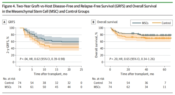3.無復(fù)發(fā)生存率(GRFS):MSCs組預(yù)估2年GRFS為59.5%(95% CI,48.1%-69.9%),對(duì)照組為26.2%(95% CI,17.6%- 37.2%),HR為0.62(95 % CI,0.39-0.98,圖4A)。盡管兩之間沒有顯著差異,但MSCs組患者的OS曲線有潛在改善(圖4B)。此外,MSCs組沒有出現(xiàn)cGVHD相關(guān)死亡病例,而對(duì)照組有5例患者死于cGVHD相關(guān)并發(fā)癥。此外,MSCs組中有嚴(yán)重出血性膀胱炎的患者癥狀得到明顯改善。