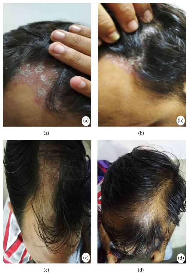 在間充質(zhì)干細(xì)胞移植治療之前,患者的頭皮顯示出大量紅斑,并帶有粘附的銀色薄片 (a, b)。在局部應(yīng)用間充質(zhì)干細(xì)胞移植一個(gè)月后記錄的銀屑病消退和炎性紅斑斑完全清除 (c, d)。