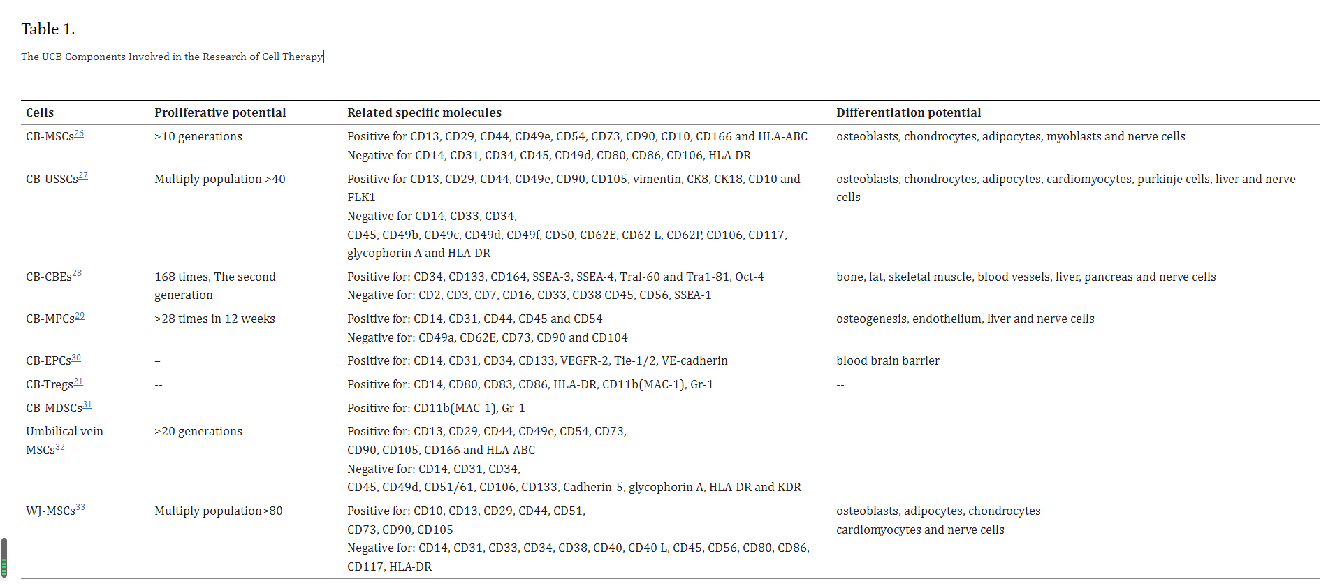 細(xì)胞治療研究中涉及的臍帶血干細(xì)胞成分顯示在表格1。與其他類型的干細(xì)胞相比,來(lái)自UCB的干細(xì)胞在CP治療安全性和有效性 、倫理學(xué)、非腫瘤增殖、可及性、易于保存和免疫反應(yīng)調(diào)節(jié)等方面具有優(yōu)勢(shì),基于動(dòng)物模型和臨床試驗(yàn)的發(fā)現(xiàn)。