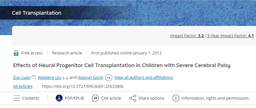 Luan Z, Liu W, Qu S, et al. Effects of Neural Progenitor Cell Transplantation in Children with Severe Cerebral Palsy. Cell Transplantation. 2012;21(1_suppl):91-98. doi:10.3727/096368912X633806
