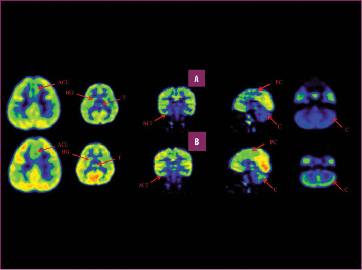 前扣帶回 (ACL)、頂葉皮層 (PC)、內側顳葉皮層 (MT)、基底神經(jīng)節(jié) (BG)、丘腦 (T) 和小腦 (C)。B 行)第一次移植后6個月后PETCT腦部掃描的干預后圖像顯示標記區(qū)域有所改善。藍色代表代謝減退區(qū)域。綠色代表正常的新陳代謝區(qū)域。圖A和B的比較顯示藍色區(qū)域顯著減少,綠色區(qū)域增加,這表明大腦的新陳代謝得到改善。