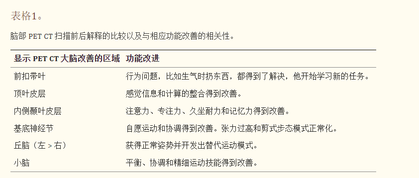 與之前的情況相比,他在矢狀面和額狀面上的體重變化有所改善;頭部、軀干和骨盆的排列也得到改善,雙側腿筋和小腿肌肉的緊繃感也有所減輕?;颊唛_始執(zhí)行雙手任務。在認知方面,由于他定期上學,他的注意力持續(xù)時間和久坐耐力也得到了改善。GMFM評分從60.67提高到67.75;GMFCS等級由Level3提升至Level2;和FIM評分從97分提高到99分。在比較第一次細胞治療之前和之后七個月期間進行的腦部PETCT掃描結果時,前扣帶葉、頂葉皮層、內側顳葉皮層、丘腦、基底神經(jīng)節(jié)和小腦(表格1)。