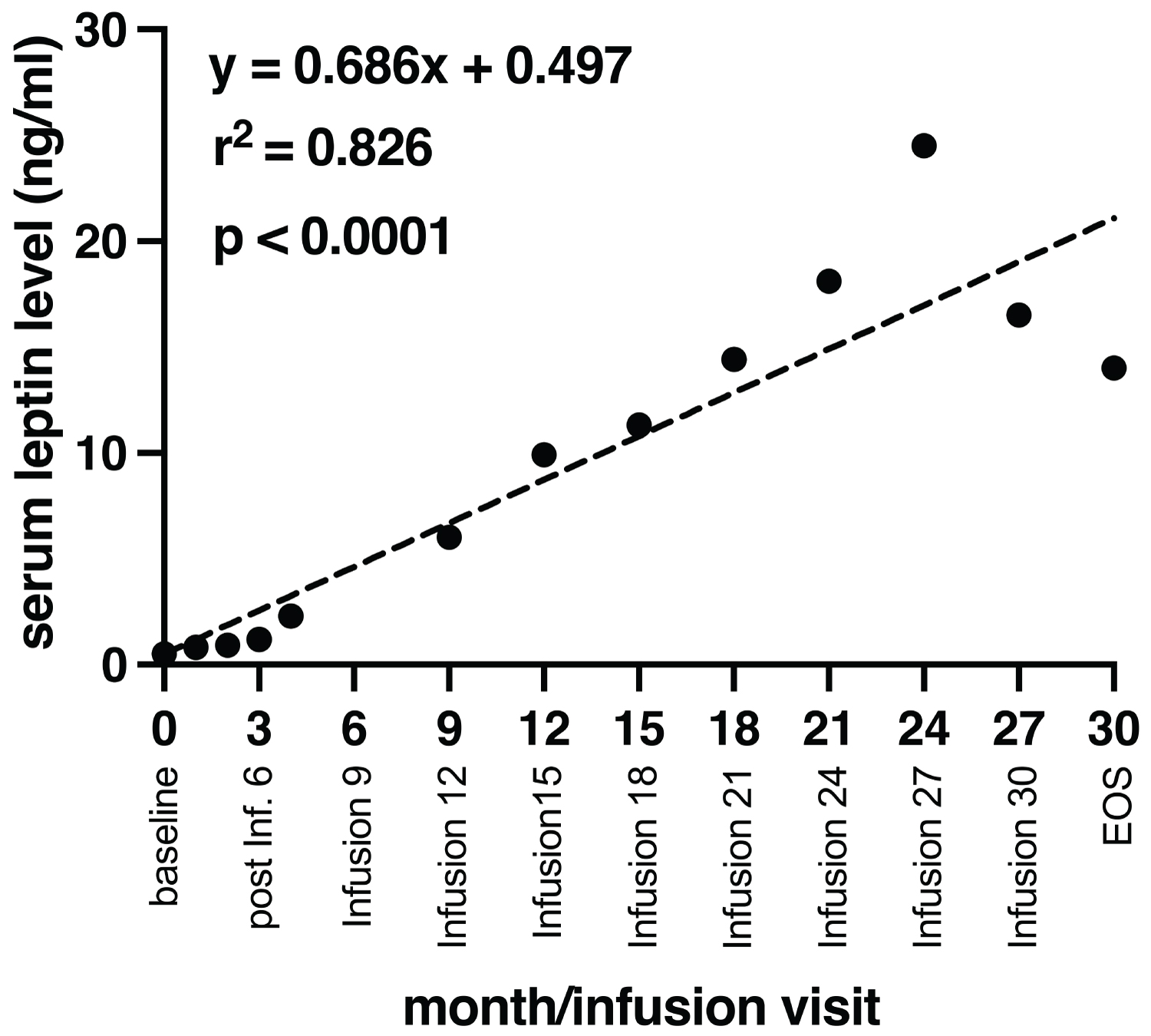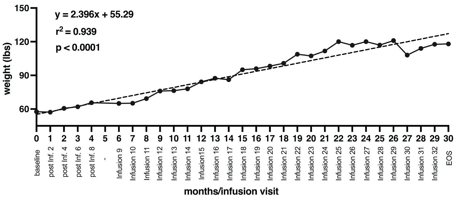 (在30個(gè)月的過程中總共進(jìn)行了32次輸注)。黑色虛線表示簡單線性回歸分析,顯示患者體重變化與輸液次數(shù)之間存在統(tǒng)計(jì)學(xué)顯著正相關(guān)。
