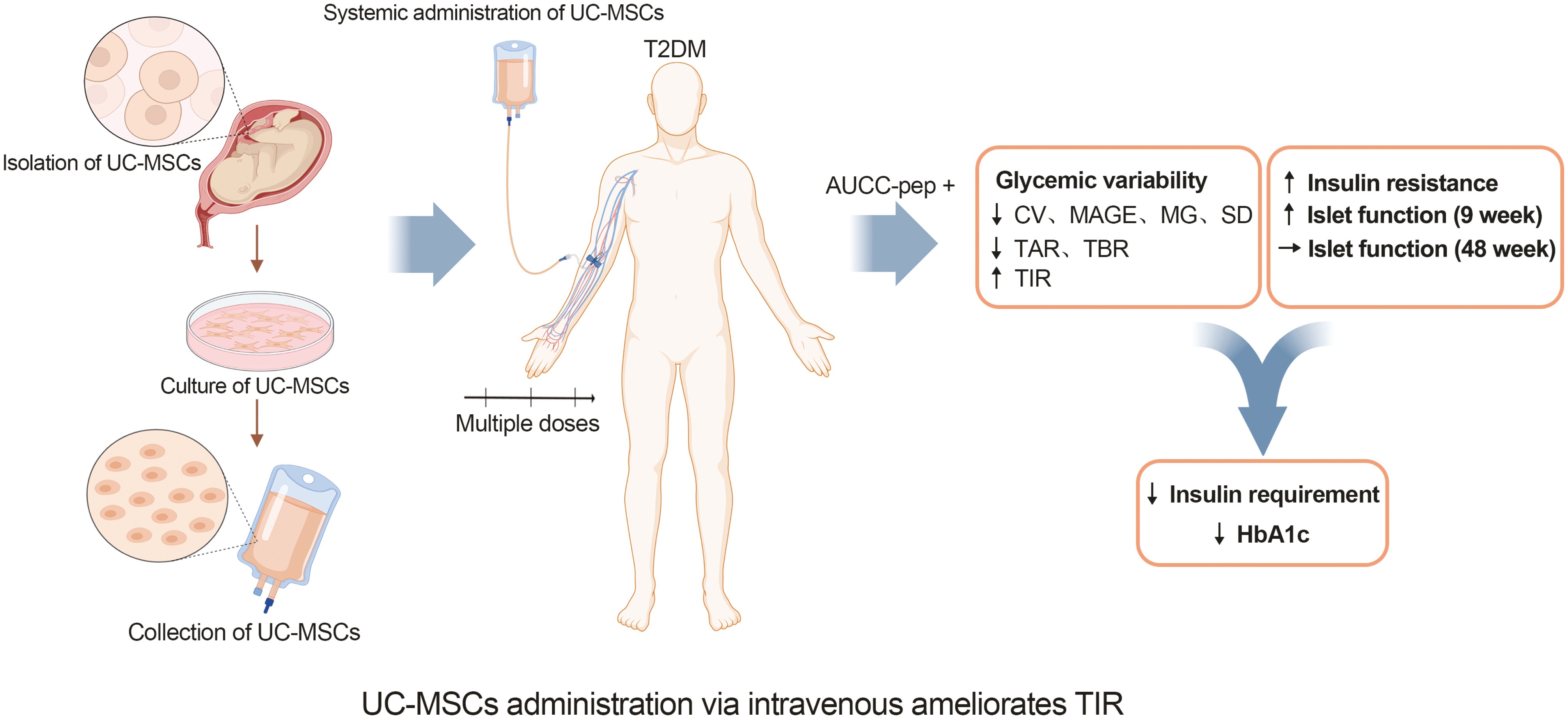 這項前瞻性、單中心、隨機(jī)、雙盲、安慰劑對照試驗表明,在肘關(guān)節(jié)靜脈輸注UC-MSC可以增加TIR,減輕血糖變異性,降低HbA1c水平,減少每日胰島素需要量,改善胰島β-細(xì)胞功能并改善胰島素抵抗。AUCC-pep是與接受UC-MSC干預(yù)的T2D療效相關(guān)的獨立危險因素,男性患者更有可能從UC-MSC治療中受益。沒有發(fā)生與UC-MSC移植相關(guān)的重大不良事件。