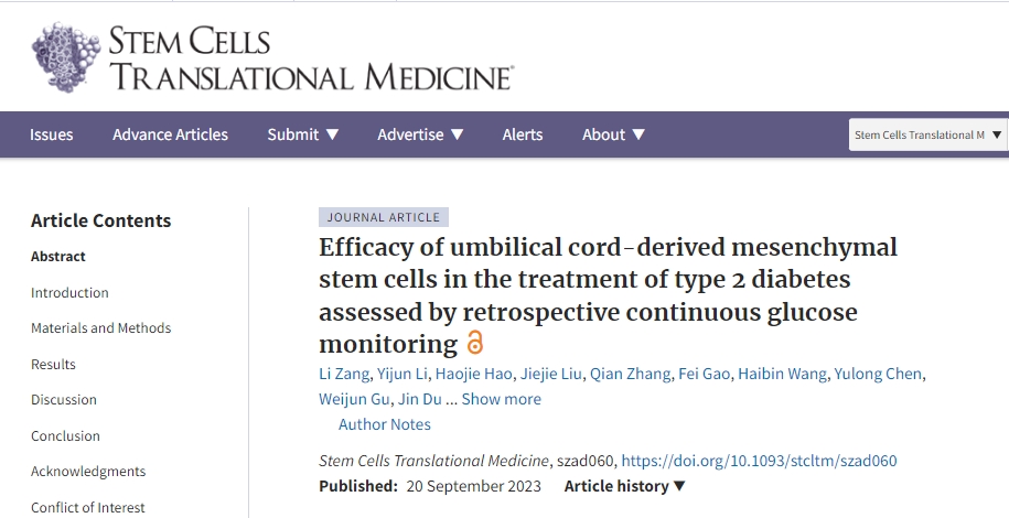 參考資料:Li Zang, Yijun Li, Haojie Hao, Jiejie Liu, Qian Zhang, Fei Gao, Haibin Wang, Yulong Chen, Weijun Gu, Jin Du, Junhua Meng, Saichun Zhang, Zhaohui Lyu, Jingtao Dou, Yiming Mu, Efficacy of umbilical cord-derived mesenchymal stem cells in the treatment of type 2 diabetes assessed by retrospective continuous glucose monitoring, Stem Cells Translational Medicine, 2023;, szad060, https://doi.org/10.1093/stcltm/szad060