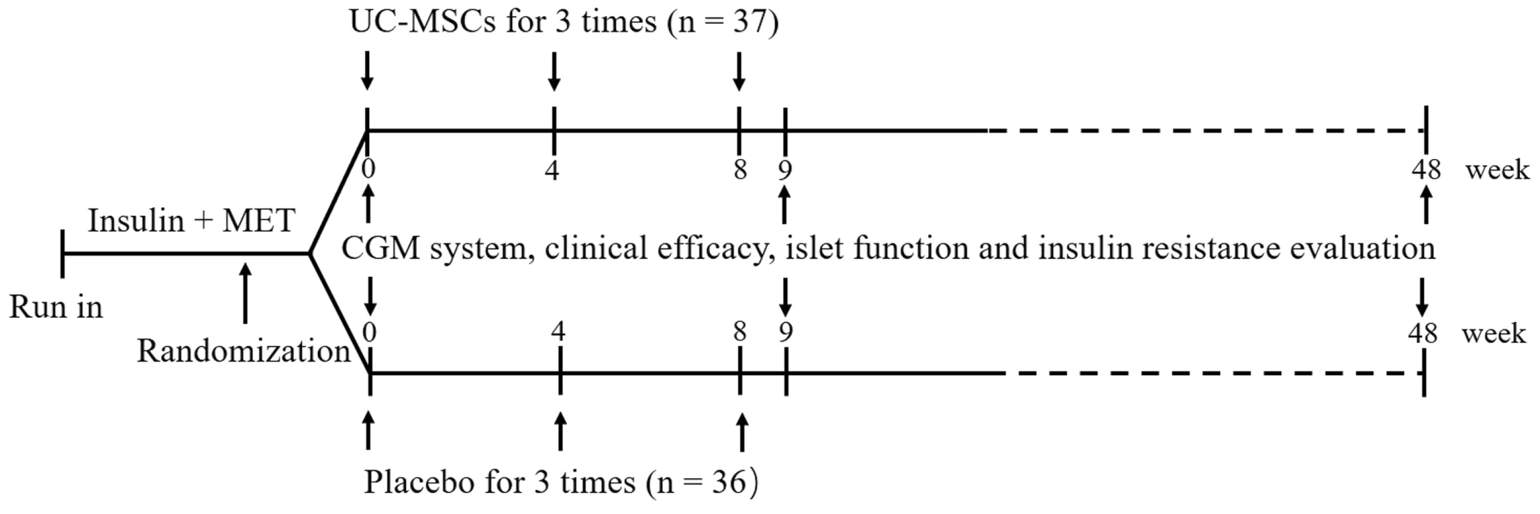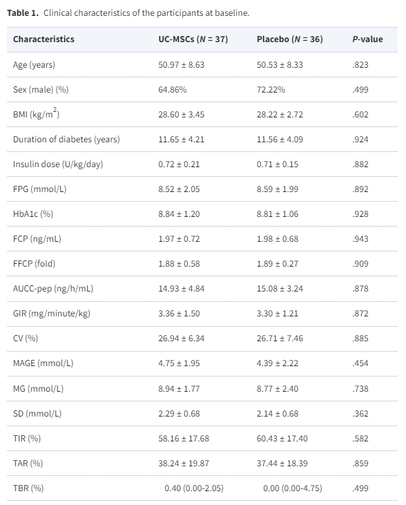 2015年10月至2018年12月期間,73名受試者(年齡在20至65歲之間,體重指數(shù)為24-40kg/m2,空腹C肽水平≥1ng/mL,HbA1c水平在7.0%至12.0%之間)接受治療納入穩(wěn)定胰島素0.5-1.0U/kg/天和二甲雙胍治療≥3個月)且患有T2D不足20年的患者。n=37) 或相同體積和外觀的安慰劑 ( n=36) 在肘關(guān)節(jié)處3次,間隔4周。本研究使用4代UC-MSCs,每次輸注UC-MSCs總數(shù)為1×106/kg。