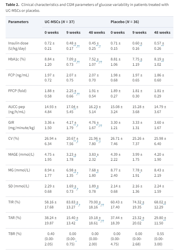 第9周時,與基線相比,臍帶-間充質(zhì)干細(xì)胞組的CGM參數(shù)(CV、MAGE、MG、SD、TIR和TAR)顯著改善,TBR降低。安慰劑組的MG、TIR)和TAR與基線相比有明顯改善,而CV、MAGE、SD和TBR沒有變化(表2)。