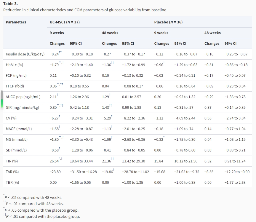 我們比較了兩組間CGM參數(shù)從基線到第9周和第48周的變化。與安慰劑組相比,臍帶-間充質(zhì)干細(xì)胞組在第9周時的CV、MAGE、MG、SD和TIR以及第48周時的CV、MAGE、MG、TIR和TAR(表3)均有更明顯的改善。