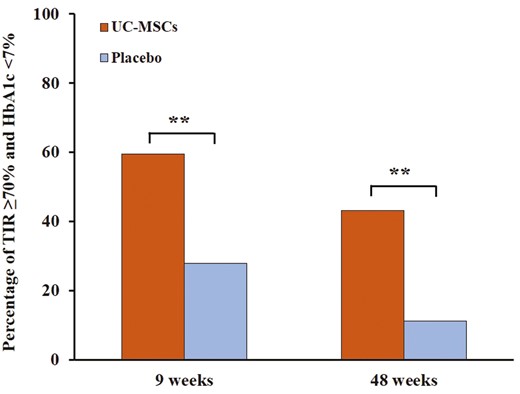 與安慰劑組相比,UC-MSCs組在第9周和第48周達(dá)到TIR≥70%和 HbA1c<7%的血糖控制目標(biāo)的患者數(shù)量多于安慰劑組(59.5%vs. 27.8%和43.2%vs11.1%)如圖2。