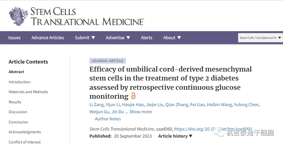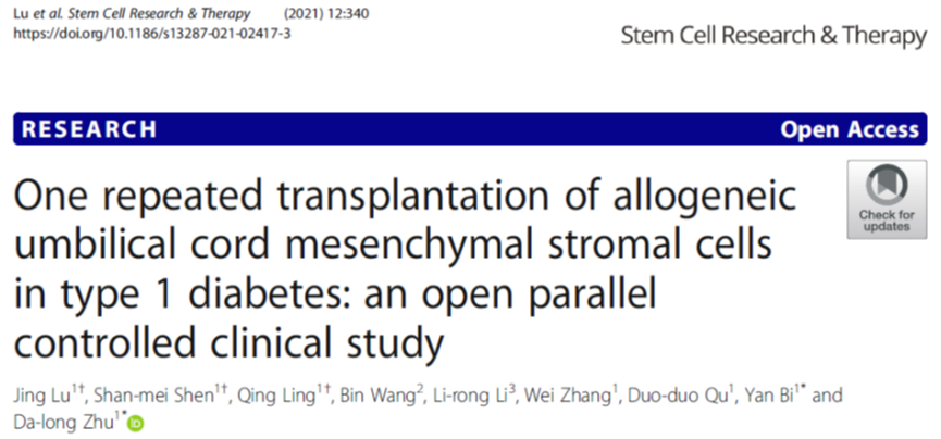2021年,南京市鼓樓醫(yī)院內(nèi)分泌科朱大龍教授團隊,在Stem Cell Research & Therapy發(fā)表了《臍帶間充質(zhì)干細胞在1型糖尿病重復(fù)移植:一項開放、非隨機、平行對照臨床試驗》[3]。