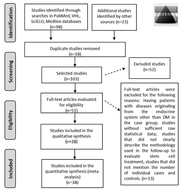 來自PubMed、SciELO、BVS、Medline等數(shù)據(jù)庫,38篇原始文獻,包括647例對照病例和654例治療病例,對1型糖尿病和2型糖尿病患者進行3、6和12個月的隨訪(圖1)。通過比較治療前后的空腹血糖和C肽水平等實驗室指標,驗證干細胞治療的有效性。