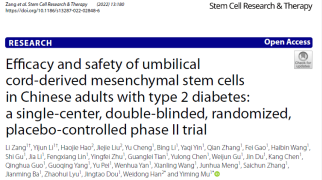 2022年5月3日,由中國人民解放軍第一醫(yī)學(xué)中心(原301醫(yī)院)內(nèi)分泌科母義明教授和生物治療中心韓衛(wèi)東教授領(lǐng)銜的一項單中心、隨機、雙盲對照間充質(zhì)干細胞治療2型糖尿病II期臨床研究結(jié)果公布,發(fā)表在《Stem Cells Research&Therapy》雜志上。