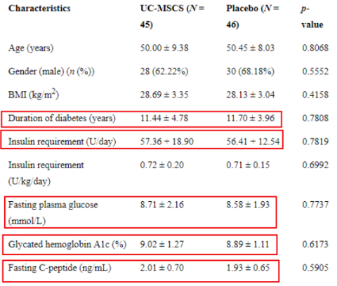 在37名接受臍帶間充質(zhì)干細胞治療的患者中,有5名患者在干細胞治療后 (12±7.6周達到無胰島素水平,并在37.2±15.2周內(nèi)也沒有再次使用。相比之下,安慰劑組的患者則必須依賴胰島素治療。