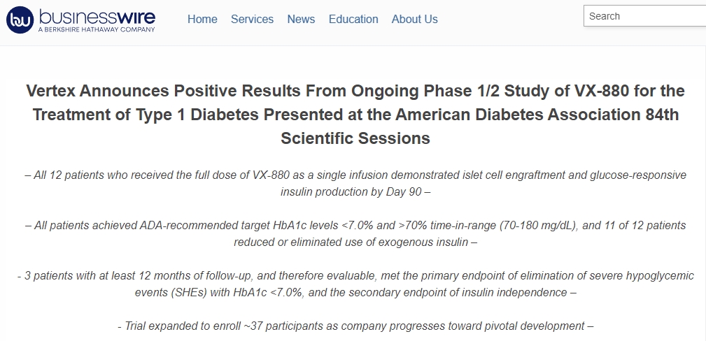 Vertex 宣布正在進(jìn)行的 VX-880 治療 1 型糖尿病的 1/2 期研究取得了積極成果,并在美國糖尿病協(xié)會(huì)第 84 屆科學(xué)會(huì)議上公布