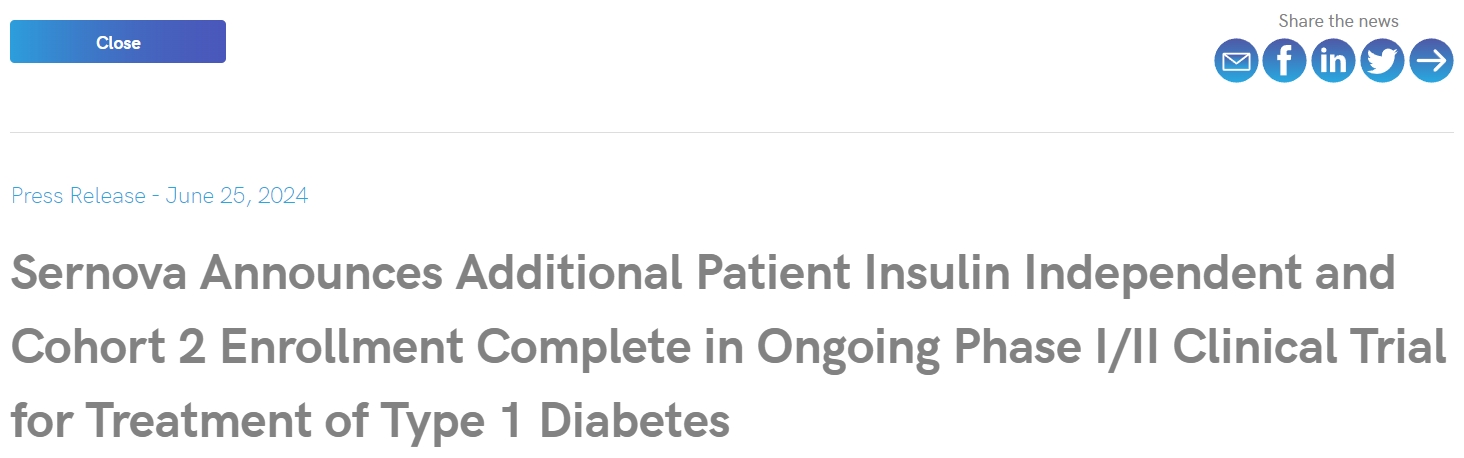 Sernova現(xiàn)臨床研究進(jìn)展:2024年6月25日,據(jù)Sernova官網(wǎng)報(bào)道Sernova宣布正在進(jìn)行的1型糖尿病治療I/II期臨床試驗(yàn)中,額外胰島素獨(dú)立患者和第2組患者入組已完成。