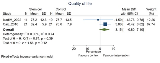 生活質(zhì)量:對(duì)兩項(xiàng)使用SF-36量表報(bào)告生活質(zhì)量 (QOL) 的研究進(jìn)行薈萃分析,結(jié)果顯示,在12個(gè)月的隨訪期間,干細(xì)胞接受者的QOL評(píng)分比對(duì)照組高出三個(gè)百分點(diǎn)(圖2)。