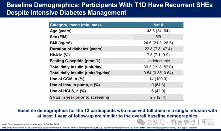 此次公布數(shù)據(jù)的I/II期研究是一項開放標(biāo)簽、單臂臨床試驗,共納入了14例低血糖感知受損(IHA)且每年至少發(fā)生兩次嚴(yán)重低血糖(SHE)事件的1型糖尿病成人患者,評估了單次輸注全劑量Zimislecel(0.8*109個細胞)后至少隨訪1年的療效和安全性。