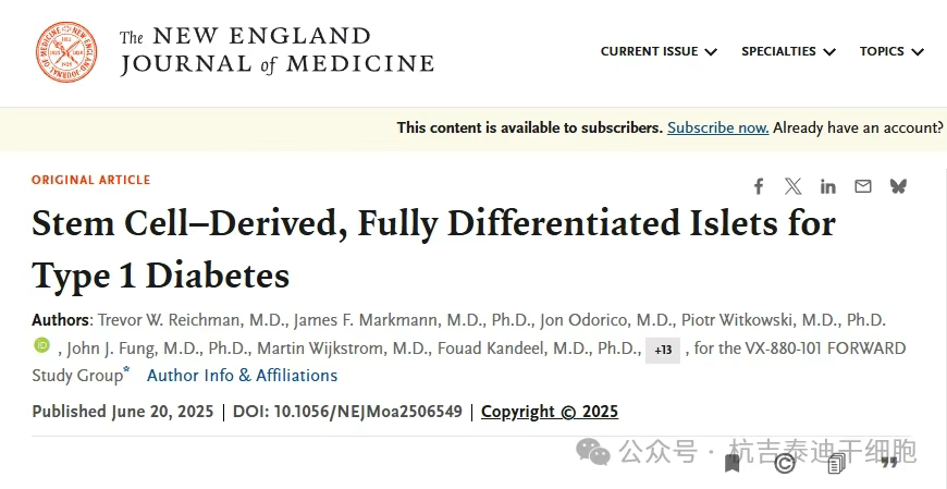 2025年6月20號《新英格蘭醫(yī)學(xué)雜志》發(fā)表了一項《干細胞衍生的完全分化胰島用于1型糖尿病》的研究結(jié)果[1]。