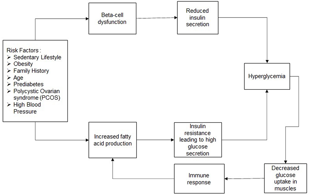 T2DM:如上所述,T2DM歸因于多種風(fēng)險因素。這些因素會在一段時間內(nèi)導(dǎo)致β細胞功能障礙。β細胞的低容量或功能障礙會減少胰腺的胰島素分泌,進而導(dǎo)致高血糖癥。這些風(fēng)險因素還會導(dǎo)致肝臟產(chǎn)生更多的脂肪酸,從而導(dǎo)致肝臟中形成大量葡萄糖分泌物。葡萄糖分泌增加會降低胰島素的功能并導(dǎo)致胰島素抵抗。高血糖導(dǎo)致肌肉吸收的葡萄糖量低,并引起免疫反應(yīng)。這會進一步損害肝臟并增加胰島素抵抗。