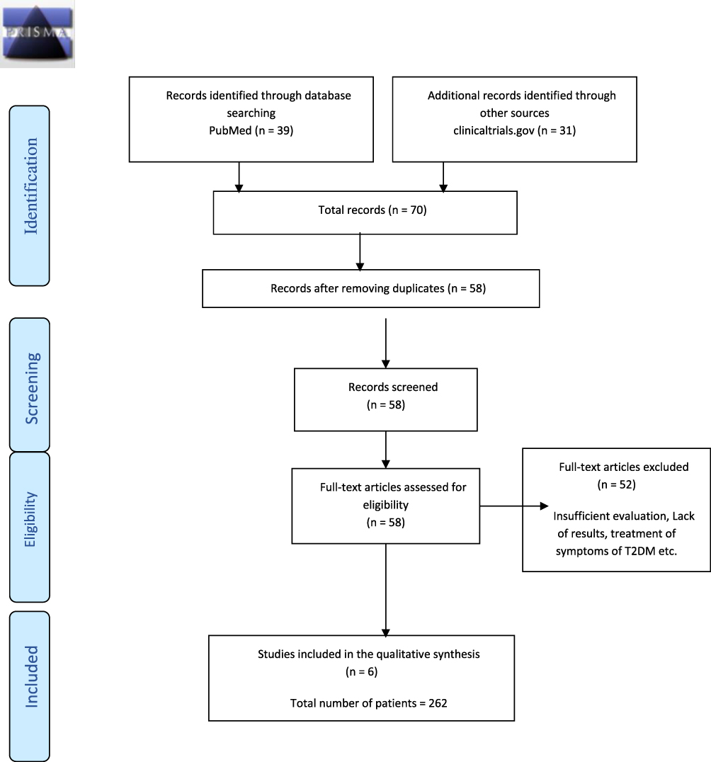 總共收集了70個試驗;檢查重復(fù)記錄后只剩下58人。在58項臨床試驗中,僅包括六項研究(T1、T2、T3、T4、T5、T6)(表1)。其余的需要更全面的結(jié)果,關(guān)于治療評估方法的信息不足,旨在報告與T2DM相關(guān)的長期合并癥而不是疾病的治療,非隨機化,參與者有其他病態(tài)。薈萃分析中包含的研究均使用自體 MSCs注射,無論其來源如何。