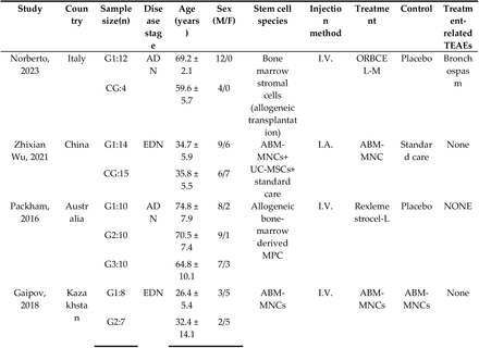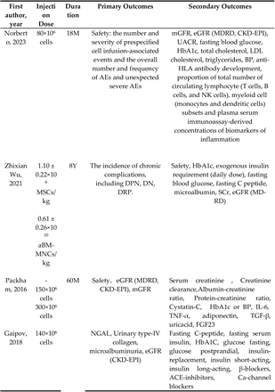 Norberto等人最近進(jìn)行了一項(xiàng)1b/2a期多中心RCT,以評(píng)估成人同種異體骨髓基質(zhì)干細(xì)胞移植對(duì)中重度DKD 患者的安全性、耐受性及治療效果。作者發(fā)現(xiàn),18周的SCT導(dǎo)致估計(jì)腎小球?yàn)V過率(eGFR)顯著改善,但不影響尿微量白蛋白/肌酐比值(UACR)。然而,Gaipov等發(fā)現(xiàn)SCT顯著降低微量白蛋白尿(MAU),而不影響eGFR或血清肌酐(SCr)水平。