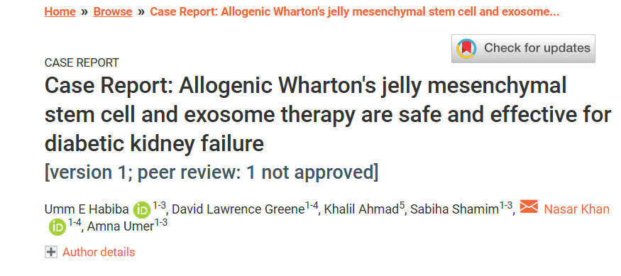 參考資料:Habiba UE, Greene DL, Ahmad K, et al. Case report: Allogeneic Wharton’s jelly mesenchymal stem cell and exosome therapy is safe and effective for diabetic renal failure [version 1; peer review: 1 not approved]. F1000Research 2024, 13 :379 (https://doi.org/10.12688/f1000research.146671.1)