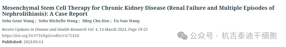 2024年3月14日,中國(guó)科研人員在期刊《疾病與健康研究最新更新》上發(fā)表了一篇關(guān)于《間充質(zhì)干細(xì)胞治療慢性腎?。I衰竭和多次發(fā)作的腎結(jié)石)》的臨床病例報(bào)告。[3]