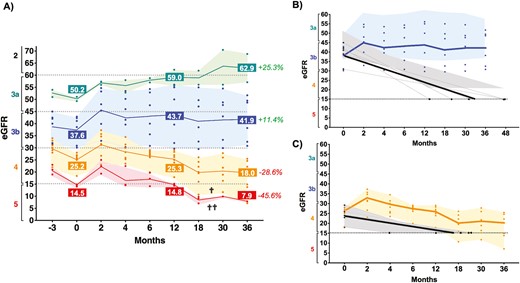 (A) 總體腎功能。從治療前3個(gè)月到治療后36個(gè)月,每位患者(彩色點(diǎn))的 eGFR(按慢性腎病類別分組)和每個(gè)階段組的平均值(實(shí)線),4個(gè)不同患者組以陰影表示顏色(3a – 綠色;3b – 藍(lán)色;4 – 橙色;5 – 紅色)。36個(gè)月時(shí)患者組的eGFR(腎功能)總體百分比改善(+,綠色)或惡化(-,紅色)。