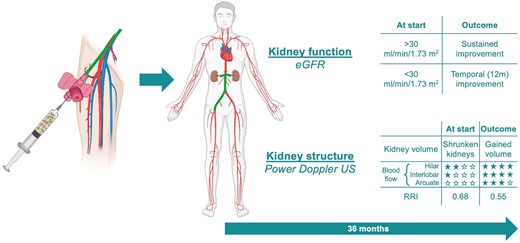 2個(gè)月時(shí)的彩色多普勒評(píng)估表明,每個(gè)評(píng)估的腎臟 (36/36) 的葉間和/或弓狀動(dòng)脈灌注水平增加,肺門動(dòng)脈 (35/36) 腎臟的阻力指數(shù)降低。超過12個(gè)月,初始eGFR<30mL/min/1.73m的患者2惡化,而那些≥30mL/minute/1.73m2進(jìn)一步維持其腎功能,表明該組可能具有腎臟保護(hù)作用。
