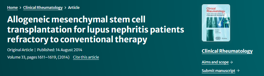 [1]Gu, F., Wang, D., Zhang, H.?et al.?Allogeneic mesenchymal stem cell transplantation for lupus nephritis patients refractory to conventional therapy.?Clin Rheumatol?33, 1611–1619 (2014). https://doi.org/10.1007/s10067-014-2754-4