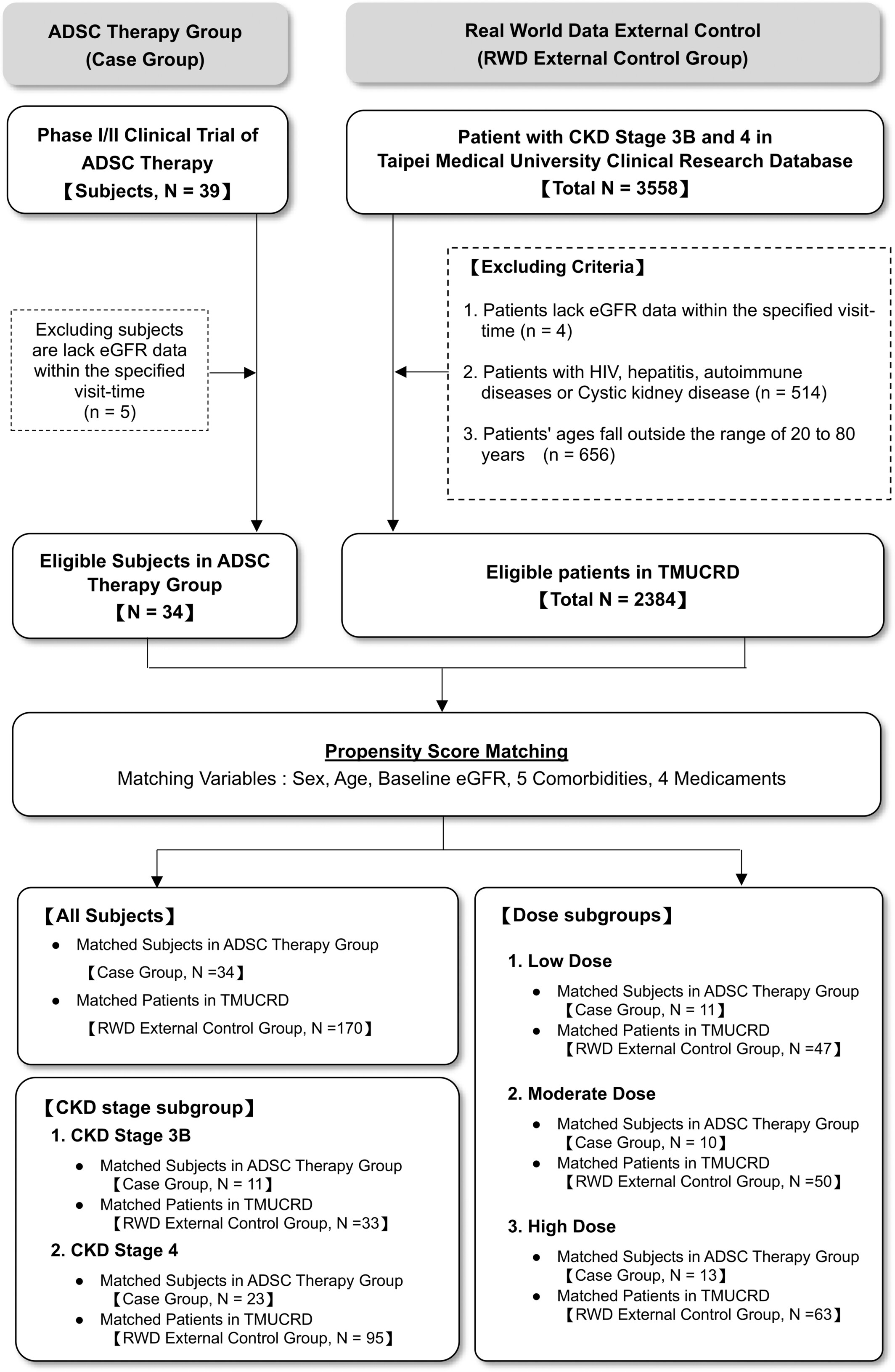 數(shù)據來源與研究對象:本研究數(shù)據源自一項評估異體ADSC療法(ELIXCYTE)的I/II期單臂臨床試驗(共39名受試者,分低、中、高三個劑量組)以及臺北醫(yī)學大學臨床研究數(shù)據庫(TMUCRD)。
