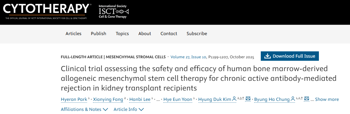 2025年10月,韓國開展的一項單臂研究納入7例慢性活動性抗體介導排斥反應(cABMR)受者,接受同種異體骨髓來源間充質干細胞輸注(4次,每兩周1次,1×10?cells/kg)。結果顯示,治療后估算腎小球濾過率(eGFR)下降斜率由?16.6%減緩至?2.4%,蛋白尿減少,供體特異性抗體(HLA-DSA)平均熒光強度(MFI)降低,T細胞亞群分析提示免疫調節(jié)向保護性方向偏移。該研究首次在cABMR人群中證實MSCs不僅安全,且具備延緩功能惡化的潛力。
