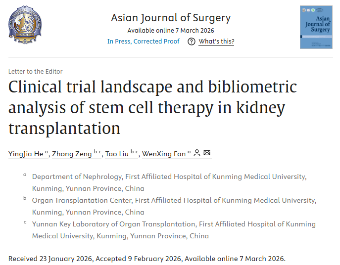 近期,《Asian Journal of Surgery》發(fā)表了一篇題為《腎移植中干細胞療法的臨床試驗概況及文獻計量分析》的綜述。該研究整合了臨床試驗注冊數(shù)據(jù)與文獻計量學方法,系統(tǒng)描繪了該領域的研究現(xiàn)狀、演進脈絡與前沿趨勢,以期為后續(xù)研究與臨床決策提供參考[1]。