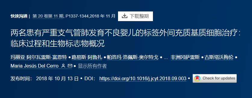 2018年,一項與該試驗相關(guān)的案例研究報告稱,在兩名患有嚴(yán)重和確診BPD的嬰兒中重復(fù)靜脈注射骨髓來源的MSC可導(dǎo)致促炎生物標(biāo)志物水平降低,而不會發(fā)生不良事件。