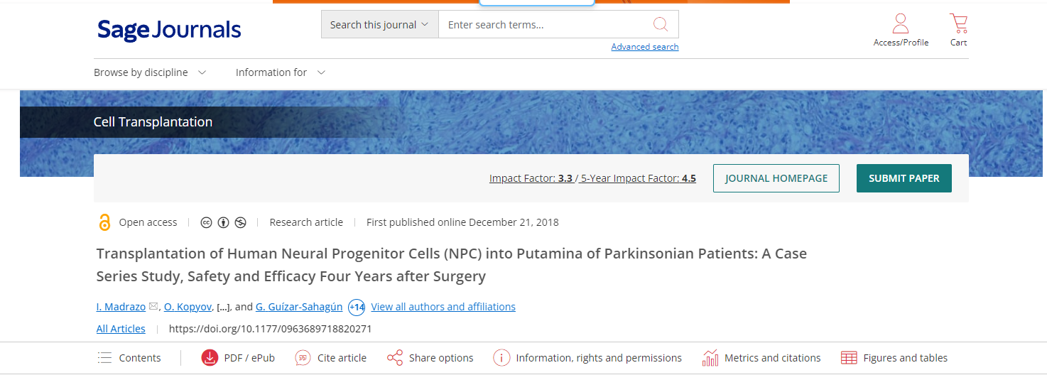 2019年,墨西哥總醫(yī)院在8名中度PD患者中測(cè)試了人類神經(jīng)祖細(xì)胞 (NPC)。該文獻(xiàn)發(fā)表在《細(xì)胞移植》期刊上,研究人員使用現(xiàn)代手術(shù),將NPC懸浮液注射到患者的雙側(cè)殼核中。細(xì)胞移植一年后,患者表現(xiàn)出不同程度的運(yùn)動(dòng)改善,其中五名患者對(duì)藥物表現(xiàn)出更好的反應(yīng)。中腦的多巴胺能活性增加。經(jīng)過(guò)4年的治療,進(jìn)展略有下降,但仍然好于最初。還注意到殼核背側(cè)多巴胺能神經(jīng)傳遞的增加,這可能與運(yùn)動(dòng)功能的改善相關(guān)。