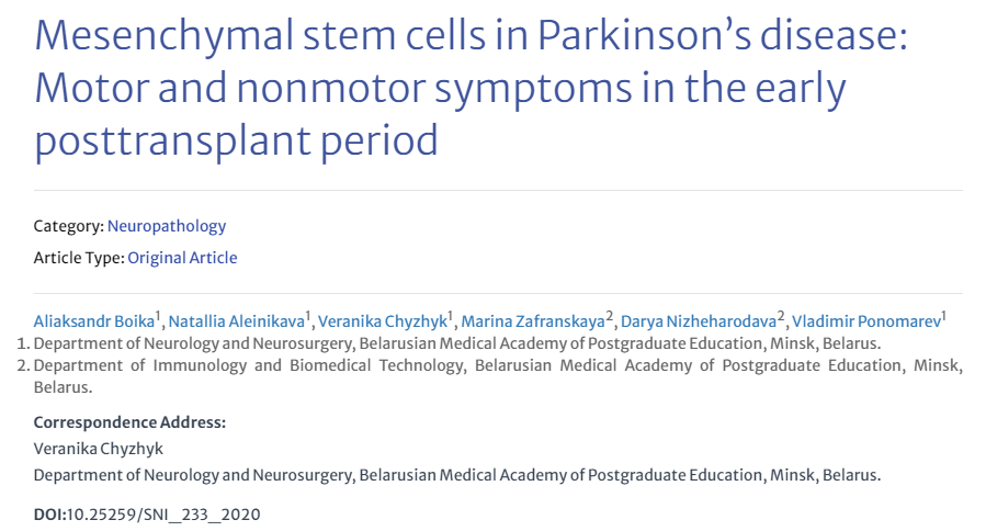 2021年,白俄羅斯研究生教育醫(yī)學(xué)院神經(jīng)內(nèi)科和神經(jīng)外科完成了一項(xiàng)I期臨床試驗(yàn)[NCT03550183],研究人員通過(guò)靜脈輸注使用臍帶間充質(zhì)干細(xì)胞(UC-MSC)來(lái)治療PD。通過(guò)不同持續(xù)時(shí)間的隨訪,研究人員測(cè)試了治療效果和生活質(zhì)量。