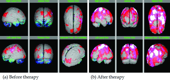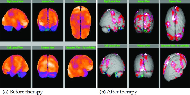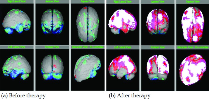 第二次治療后的大腦SPECT掃描顯示左側(cè)小腦區(qū)域有輕微的灌注不足。大腦和小腦區(qū)域的灌注顯著改善。圖1代表患者在第二次治療之前和之后的SPECT掃描圖像。